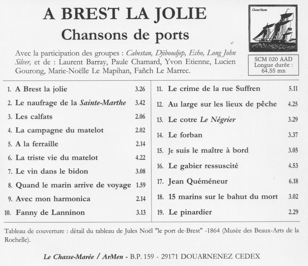 Le second volume sur CD de l’Anthologie (1991) est consacré aux « chansons de port », et Brest y a une place de choix. Les chanteurs et groupes sont d’ailleurs tous bretons, voire brestois : Cabestan, Djiboudjep, Echo, Long John Silver ; Paule Chamard, Yvon Etienne, Lucien Gourong, Marie-Noëlle Le Mapihan, Fañch Le Marrec… à l’exception du Normand Laurent Barray ! Un répertoire que l’on chantait après l’avoir entendu par des chanteurs de rue vendant leurs « feuilles volantes » racontant Le crime de la rue Suffren, mais aussi l’héroïsme du matelot d’un dundée de Groix mort en voulant sauver un marin tombé à l’eau…