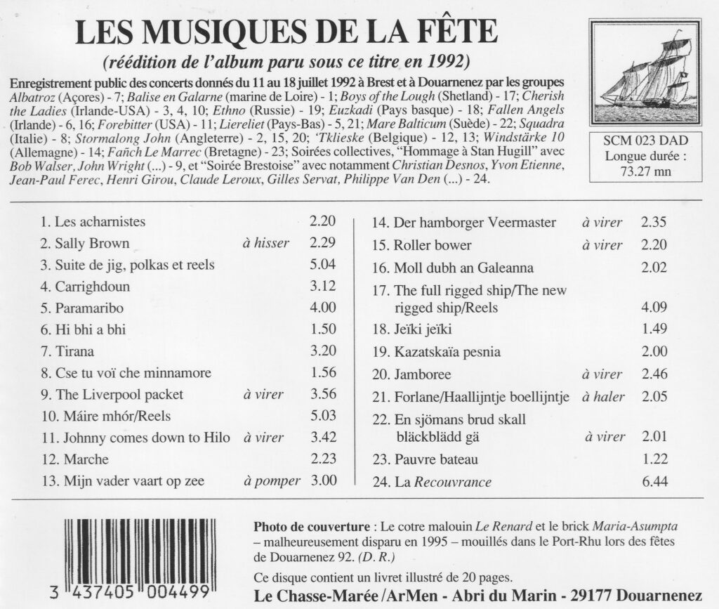 Ce CD de l’Anthologie (1992) offre une sélection de chants enregistrés lors des concerts donnés lors de la première édition de la grande fête maritime de Brest en 1992, et lors de la fête maritime de Douarnenez 92, qui l’a suivie en accueillant l’immense flotte ayant navigué de la rade de Brest vers la baie de Douarnenez. Huit jours de fête ! Une succession de moments musicaux forts sur ce disque, donnés par des groupes faisant découvrir des chants de marins des Etats-Unis, du Québec, d’Islande, de Norvège, de Suède, de Russie, d’Allemagne, de Belgique, de Grande-Bretagne, d’Irlande, de France, d’Italie, des Açores…