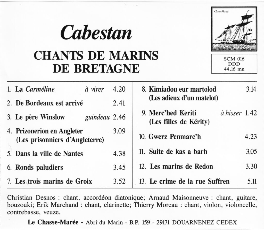 Ce CD (1991) propose un répertoire en breton et en français, mettant en valeur les styles très ancrés et très personnels de chacun des chanteurs du groupe. On y trouve des chants en breton jusqu’alors peu mis en valeur dans les groupes de chants de marins : Prizonerion en Angleter, Merc’hed Keriti (un chant à hisser), Gwerz Penmarc’h… Mais aussi le classique brestois chanté, bien sûr, par Christian Desnos Le crime de la rue Suffren. En 1993, Cabestan était composé de Christian Desnos, Arnaud Maisonneuve, Erik Marchand, Thierry Moreau.