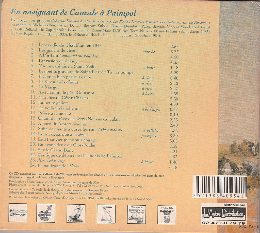 Dans la lignée de l’Anthologie des chansons de mer du Chasse-Marée, ce CD présente les répertoires des marins des ports qui jalonnent la côte bretonne de la Manche entre le Cotentin et la côte trégoroise. Des communautés maritimes marquées par la pêche à la morue à Terre-Neuve (Cancale/Saint-Malo, mais aussi Binic…) et à Islande (Paimpol, où les marins sont bretonnants). Sans oublier les îles anglo-normandes. Ce disque collectif permet d’entendre, en parallèle aux chanteurs et aux groupes, d’anciens cap-horniers, terre-neuvas et islandais.