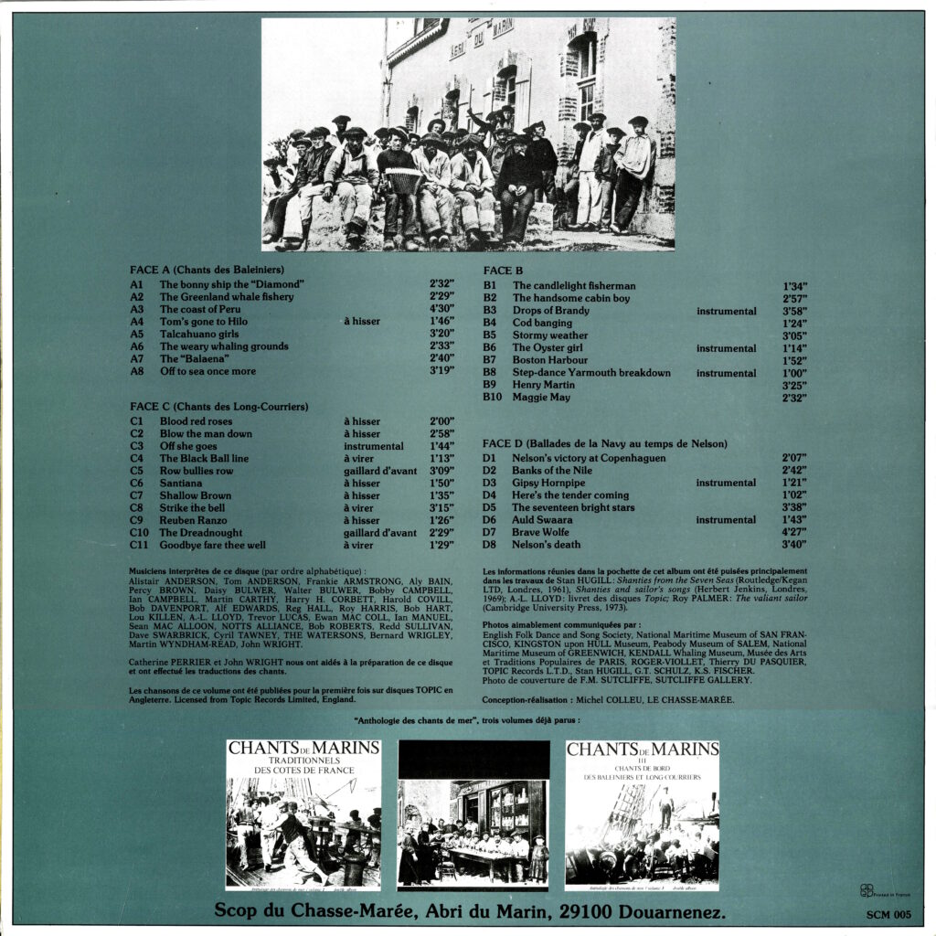 Le quatrième double 33 t. de l’Anthologie (1984) fait découvrir la richesse et la diversité des marins de Grande Bretagne et d’Irlande. Le volume offre une sélection d’enregistrements extraits de 19 33 tours publiés entre 1950 et 1980 par Topic : chants de long-courriers, de baleineirs, de la Navy au tempq des guerres Napoléoniennes, ballades sur la vie de des quartiers portuaires. Avec de nombreux artistes de référence : Watersons, A. L. Loyd E. Mac Coll…