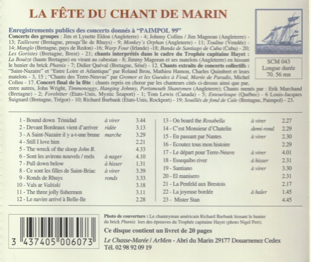 Ce CD de l’Anthologie (1999) offre des extraits de concerts donnés lors de la quatrième édition de la Fête du chant de marin de Paimpol en 1999. Le programme musical était alors entièrement consacré aux musiques du monde maritime. On entend sur ce CD douze groupes ainsi qu’une quinzaine de meneurs, enregistrés dans leurs concerts, mais aussi lors de concerts thématiques collectifs, lors du concert collectif final de la fête, ou durant la seconde édition du concours de chants de marins « Trophée capitaine Hayet ».