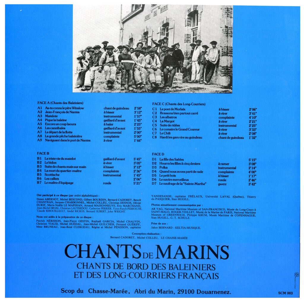 Le troisième double 33 t. de l’Anthologie (1983) est consacré aux chants de bord. Y sont endisqués des chants spécifiques aux baleiniers (Naviguant dans le port de Nantes, La grande pêche baleinière) ou aux cap-horniers (Brassons bien partout carré). Quant aux classiques du chant à hisser, Jean-François de Nantes, Le pont de Morlaix, ils sont interprétés en respectant les rythmes liés à la manœuvre, ce qui était à l’époque une nouveauté.