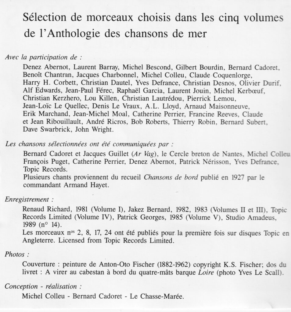 Voici un CD (1989) offrant une sélection de morceaux parus dans les cinq volumes double 33 tours de l’Anthologie des chansons de mer. L’occasion d’entendre certains des nombreux chanteurs qui ont participé à ces disques parus entre 1981 et 1985. Pas moins de 51 chanteuses et chanteurs sont présents dans ce disque, souvent en tant que meneurs des chansons. Le répertoire fait la part belle aux chants en français, mais on y entend aussi de magnifiques chants en anglais.