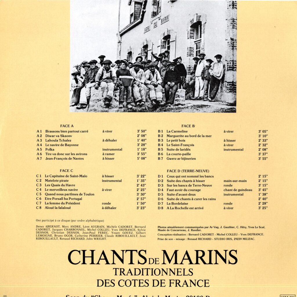Ce double 33 t. paru en 1981, premier volume de l’Anthologie des chansons de mer, fait découvrir des chants, souvent inédits, issus de collectes auprès des marins, dont beaucoup sont devenus depuis des classiques : Roulez jeunes gens, Gwerz ar bijinerien, La Carmeline, Faut avoir du courage… Les styles des chanteurs de ce disque collectif, bons connaisseurs de la tradition orale populaire, renouvellent, à l’époque comme encore aujourd’hui, l’approche de ce genre musical.