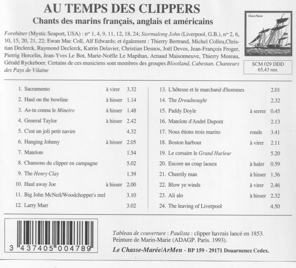 Au milieu du XIX e siècle les clippers règnent sur les mers : ces paquebots à voile transportent les émigrants vers les Amériques. A bord des navires anglais ou américains, mais aussi de ceux armés au Havre, résonnent de nombreux chanteys pour soutenir les manœuvres et autres chants de « gaillard d’avant ». Ce disque collectif (1993) propose une plongée dans le répertoire en vogue vers 1850 : Sacramento, The leaving of Liverpool, Haul away Joe, mais aussi La chanson du clipper en campagne, L’hôtesse et le marchand d’hommes…