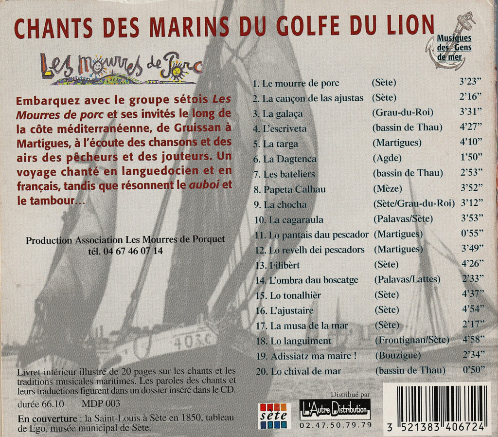 Dans la lignée de l’Anthologie des chansons de mer du Chasse-Marée, ce CD présente les répertoires des gens de mer de Gruissan à Martigues, dont bien sûr les Sétois, et ceux de l’étang de Thau. Le groupe Mourres de porc propose une sélection parmi les chants qu’il a recueillis, et qui pour certains résonnent encore lors des joutes ou des fêtes. Reflet de la riche histoire de la pêche dans le golfe du Lion, les chansons sont en français, en sétois, en occitan ou en dialectes italiens.