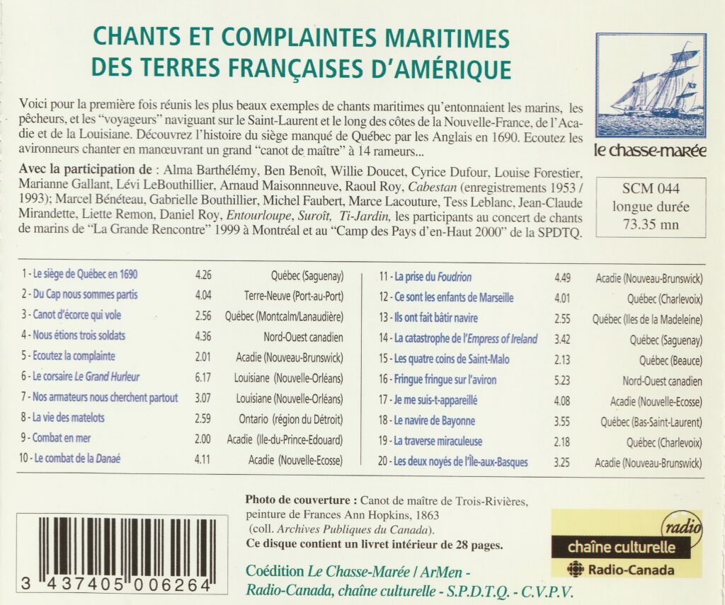 Ce CD de l’Anthologie (1998) préparé avec Robert Bouthillier et coédité avec Radio Canada, accompagné d’un livret très fourni sur les sources des chansons, réunit pour la première fois les plus beaux exemples de chants maritimes qu’entonnaient les marins, les pêcheurs et les « voyageurs » naviguant sur le Saint-Laurent et le long des côtes de la Nouvelle-France, de l’Acadie et de la Louisiane. Découvrez l’histoire du siège manqué de Québec par les Anglais en 1690, ou écoutez les avironneurs chanter en manœuvrant un grand « canot de maître » à 14 rameurs…
