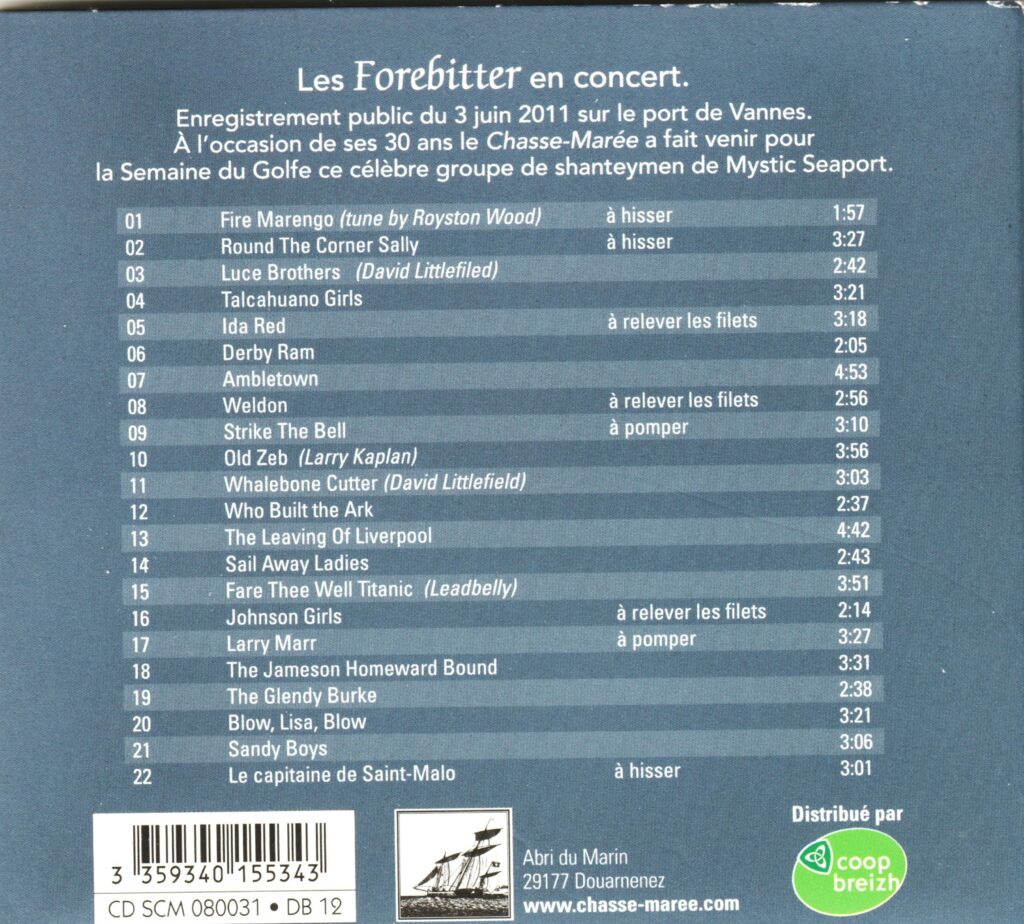 Ce CD est l’enregistrement d’un concert donné à Vannes durant la Semaine du Golfe 2011 pour marquer les 30 ans du Chasse-Marée. Le trio Forebitter est alors composé de Geoff Kaufman, Craig Edwards et Daniel Spurr. Ces chanteymen américains assuraient alors l’animation du port-musée de Mystic Seaport, près de Boston, maîtrisant parfaitement la manière de chanter pour mener les manœuvres. Avec un art subtil de la polyphonie, ils nous offrent ici un bel échantillon du répertoire des marins américains