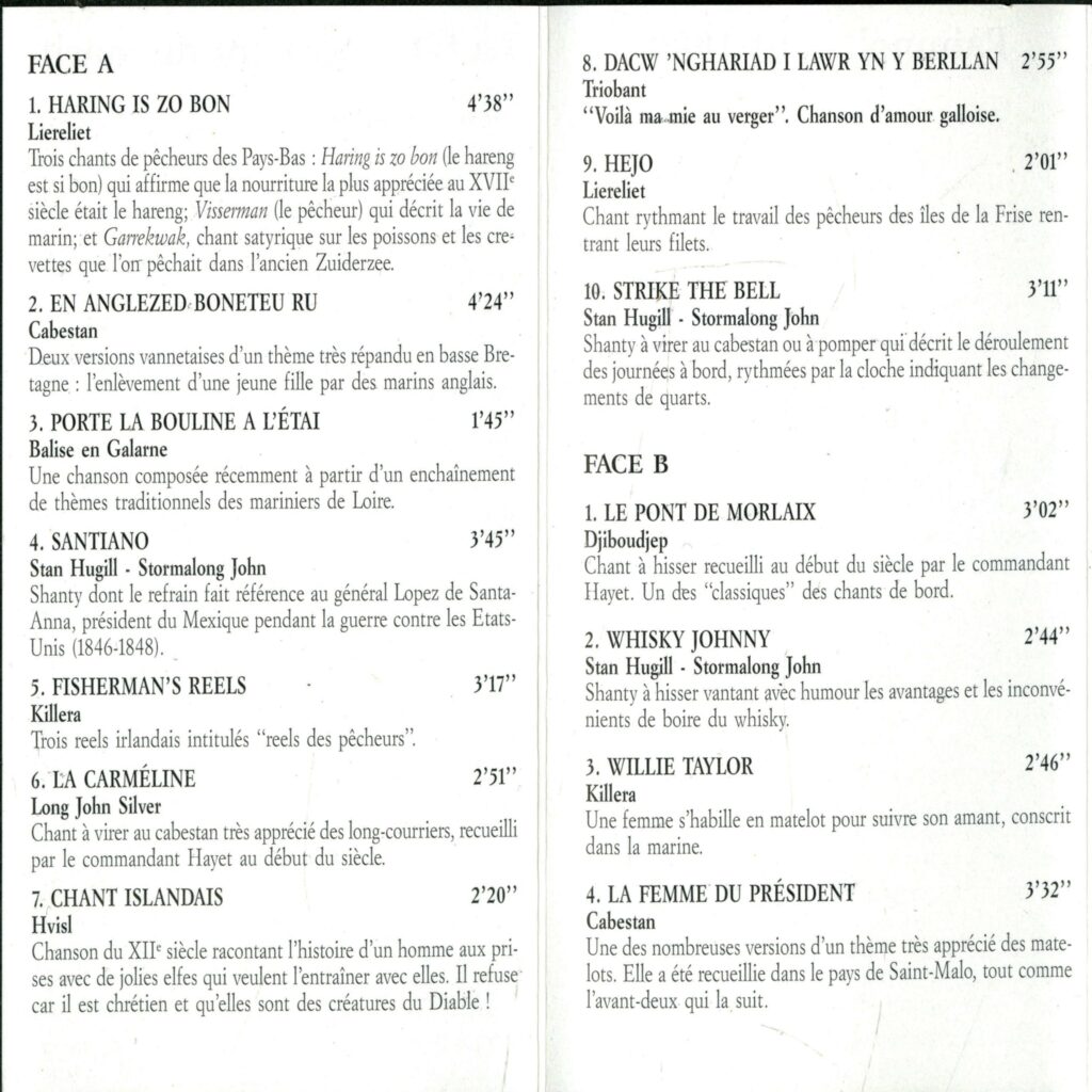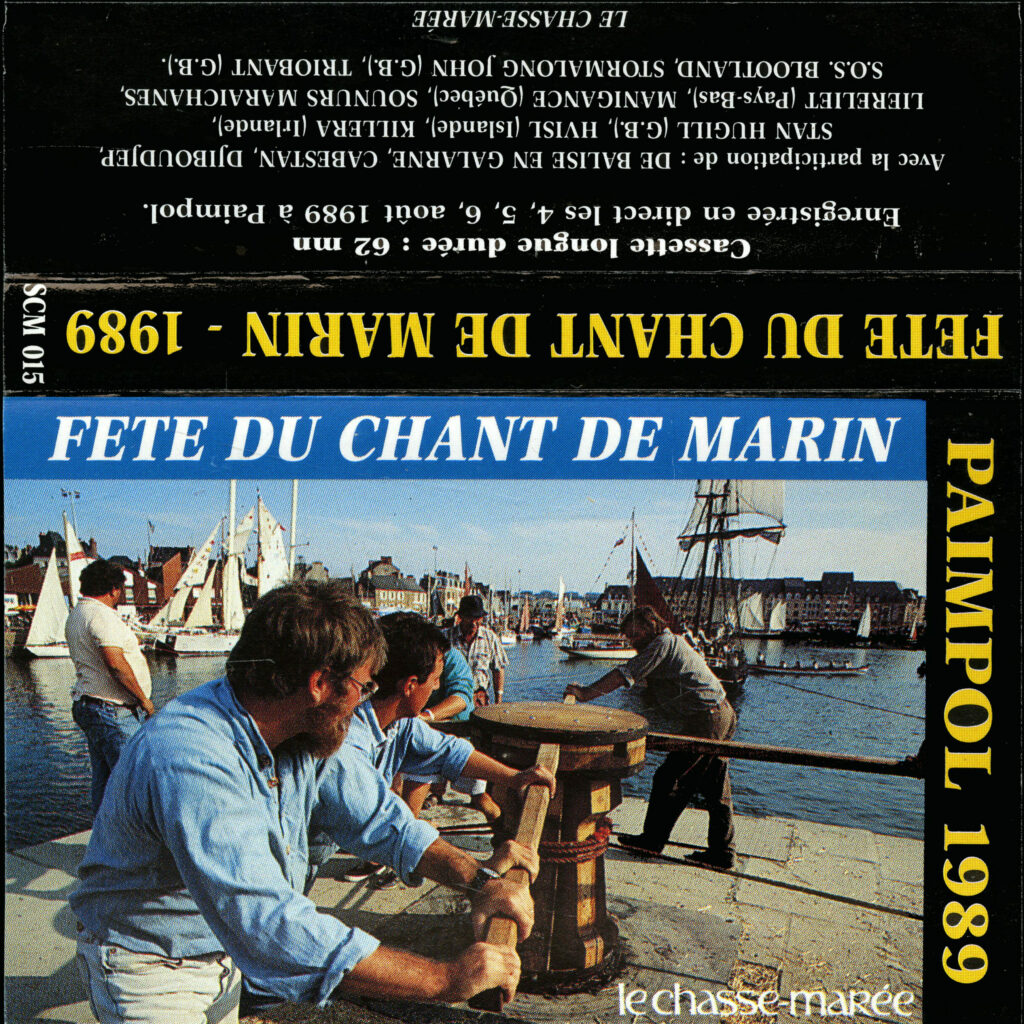 Voici une rareté : une cassette éditée en 1989 proposant des extraits des concerts donnés lors de la première édition de la Fête du chant de marin de Paimpol en 1989. Le programme musical était alors uniquement dédié aux groupes et chanteurs faisant découvrir les chansons des gens de mer (d’où le nom donné à la fête). On y entend le grand chanteyman anglais Stan Hugill accompagné par Stormalong John et des groupes dont Liereliet (Pays-Bas), Cabestan (Bretagne), Balise en Galarne (Anjou, bords de Loire), Killera (Irlande), Long John Silver (Bretagne)…