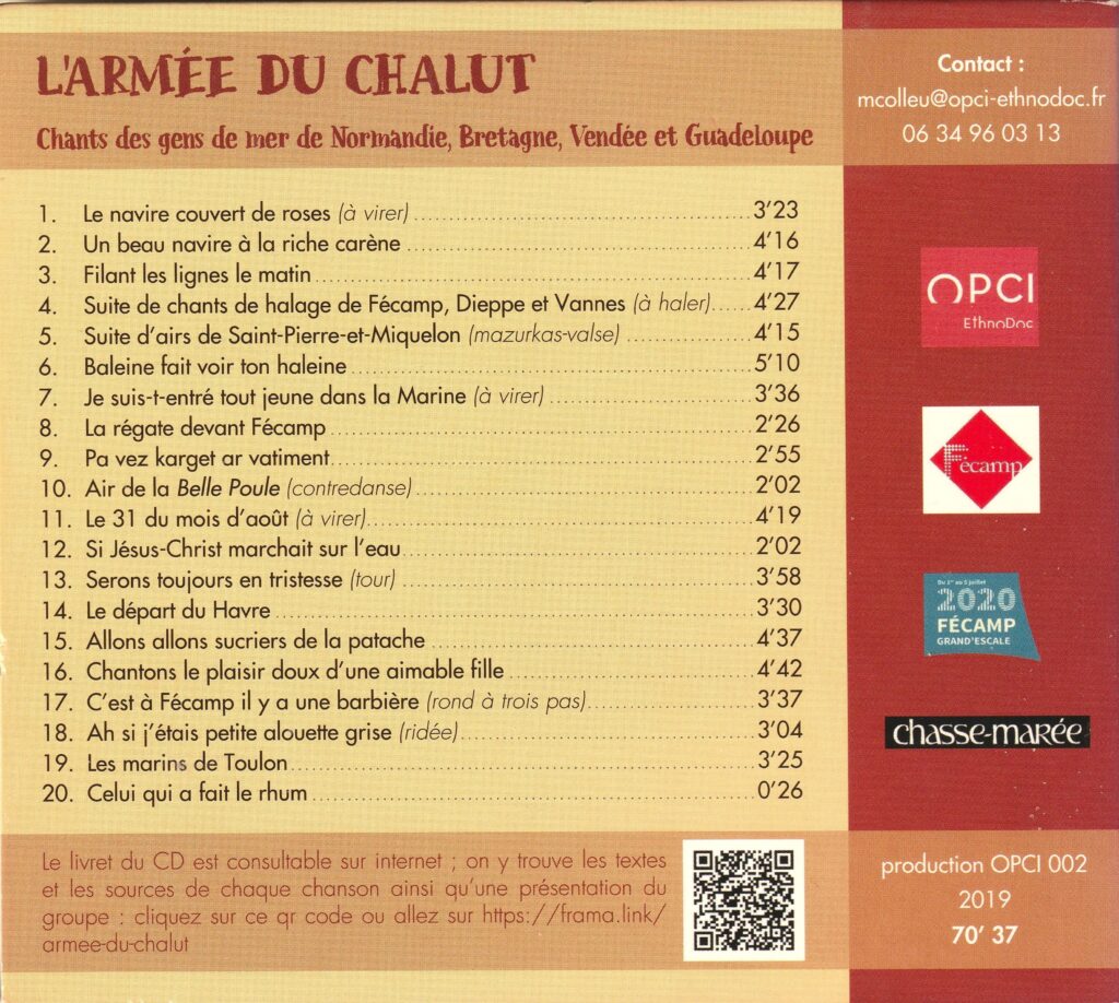 Voilà un CD réalisé par un équipage de « pêcheurs de chants » formé de chanteurs-sonneurs-animateurs confirmés, comprenant les Bretons Bernard Subert, Gaël Rolland et Didier Quéval, le Fécampois Pascal Servain, le Vendéen Maurice Artus, le Guadeloupéen Césaire Berchel et Michel Colleu, le plus Havrais des Douarnenistes. Le collectif L’Armée du Chalut rassemble depuis 2004 des chanteurs reconnus, certains étant aussi collecteurs de chants. Il nous offre ici un superbe échantillon des répertoires qu’ils ont recueillis en Normandie, Bretagne, Vendée et Guadeloupe. La plupart des chansons étaient jusque-là inédites. Les chants sont soutenus par des couleurs instrumentales peu courantes dans les groupes de chants de marins actuels : vielle à roue, violon, clarinette, concertina, accordéon.