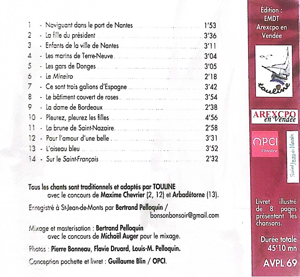 Les six chanteurs et musiciens de Touline, groupe créé en 1996, chantent le répertoire des populations maritimes de Vendée, où ils habitent. Grâce aux nombreuses enquêtes menées depuis des décennies dans les ports du littoral vendéen (Saint-Gilles-Croix-de-Vie, Les Sables-d’Olonne…) ainsi que dans les îles d’Yeu et de Noirmoutier, ils peuvent puiser dans un vaste fonds de complaintes ou de chants de travail, mais aussi comme l’attestent les beaux exemples de ce disque, de diverses formes de rondes chantées (rond et demi-rond de l’île d’Yeu, grand’danse…).
